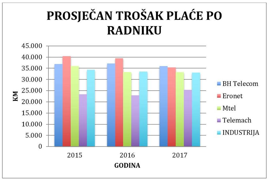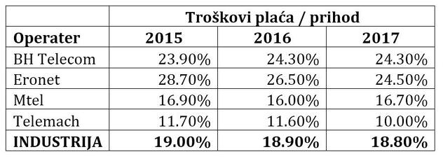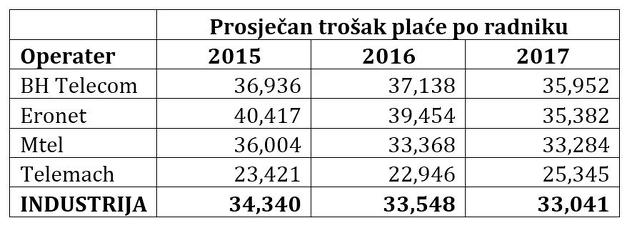 Ukoliko ove podatke usporedimo sa prosječnim troškovima plaća po zaposlenom, možemo ustvari vidjeti jednu od suštine problema vodećih kompanija u ovoj djelatnosti. Prosjek troškova plaće po zaposlenom smanjio se u periodu 2015.-2017. za 3,78 posto. Iako su Eronet i Mtel uspjeli znatnije smanjiti troškove plaća zaposlenih u ovom periodu, to se ne može reći i za BH Telecom. Ove tri vodeće kompanije imaju troškove plaća po zaposlenom iznad prosjeka industrijske grane. Za razliku od njih, Telemach je imao rast prosječnih troškova plaće po zaposlenom, ali je to i dalje daleko ispod prosjeka industrijske grane.