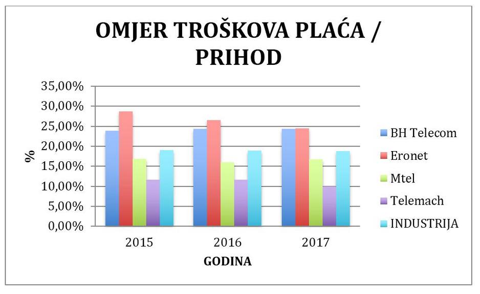 Upravo je pokazatelj odnosa troškova plaća i prihoda bitan kako bi se pokazala ukupna pozicija vodećih kompanija na tržištu. Tendencije ovog odnosa za nivo industrije su dosta stabilne, nije bilo značajnih promjena u posljednjim godinama. Međutim, kada je u pitanju BH Telecom, došlo je do malog povećanja ovog odnosa, što u principu znači da jedan zaposleni radnik u BH Telecomu, četvrtinu ostvarenog prihoda po radniku iskoristi za prosječnu plaću.