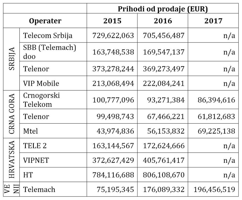 Posmatrajući neke od pokazatelja (prihodi od prodaje i neto dobit) za najveće kompanije ove industrijske grane zemalja u regionu, oni pokazuju vrlo slične tendencije, kao i što je to slučaj i BiH. Neke od kompanija imali su pad prihoda od prodaje, a time i dobiti, za razliku od drugih, koje su iskoristile priliku na tržištu, te preuzele dio tržišnog udjela od drugih kompanija. Primjer za to su VIP Mobile i SBB (Tele––mach) u Srbiji, Mtel u Crnoj Gori, te Telemach u Sloveniji, koji je imao najveći rast prihoda od prodaje.