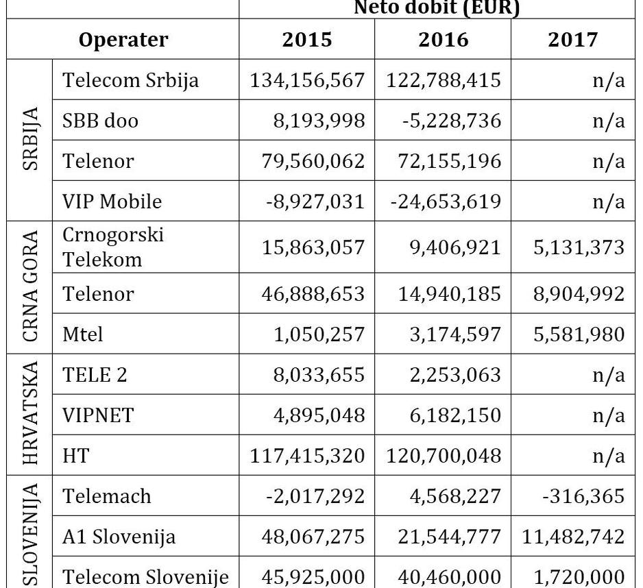 Sa druge strane, ukoliko analiziramo pokazatelj neto ostvarene dobiti, na osnovu dostupnih podataka, jedino je Mtel u Crnoj Gori uspio ostvariti rast, za razliku od drugih kompanija koje su ostvarile pad dobiti, što pokazuje, da je na nivou cijele grane, došlo do pada dobiti.