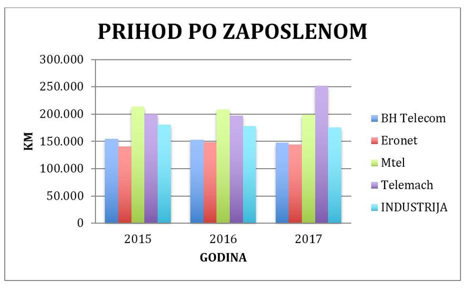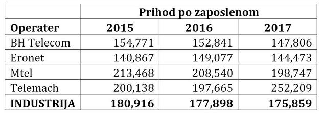 Posmatrajući prihod po zaposlenom na nivou industrije, iako je došlo do smanjenja broja zaposlenih, on je ipak pao najviše zbog pada prihoda cijele industrije. Ipak, sve tri vodeće kompanije ostvarile su pad prihoda i po zaposlenom. Od vodećih kompanija, jedino je Mtel imao prihod po zaposlenom veći od prosjeka industrije. Za razliku od vodećih kompanija, Telemach, koji je imao u 2015. godini prihod po zaposlenom manji od Mtel-a, u 2017. godini ih je prestigao i na taj način izbio na prvo mjesto, ostvarujući na taj način prihod po zaposlenom veći od 100.000 KM u odnosu na BH Telecom ili Eronet.